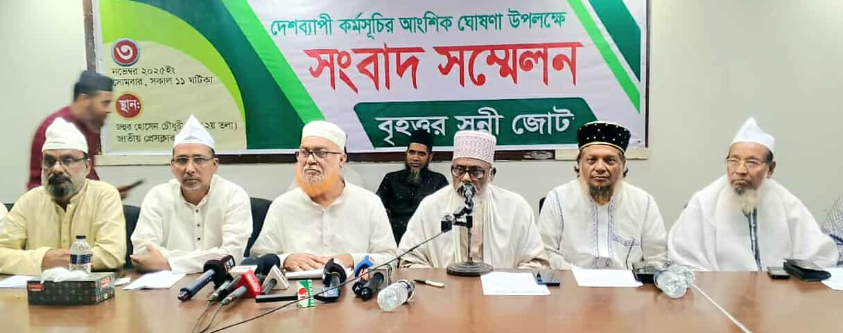 বৃহত্তর সুন্নী জোটের উদ্যোগে সোমবার ৩ নভেম্বর ঢাকা জাতীয় প্রেসক্লাব জহুরুল হক হলে সংবাদ সম্মেলনে আগত বৃহত্তর সুন্নী জোট নেতৃবৃন্দ বলেন-নির্বাচন কমিশন কর্তৃক ফেব্রুয়ারী '২৬ এ ত্রয়োদশ জাতীয় সংসদ নির্বাচন অনুষ্ঠানের ঘোষণা দেয়া হলেও এখনো চূড়ান্ত তারিখ ঘোষণা না করাতে অপ্রয়োজনীয় বিতর্কের জন্ম দিচ্ছে। অদ্যাবধি রাজনৈতিক দলগুলোর মধ্যে কোনরূপ ঐকমত্য প্রতিষ্ঠিত হয়নি। জাতির মধ্যে বিভাজন সৃষ্টি করে একটি সর্বজন গ্রহণযোগ্য নির্বাচন আয়োজন সম্ভব নয়। সংবাদ সম্মেলনে বক্তারা অভিযোগ করে বলেন-গত দেড় দশকে অনুষ্ঠিত জাতীয় নির্বাচনগুলো ছিল বিতর্কিত। জনগণ ভোটাধিকার প্রয়োগ থেকে বঞ্চিত হয়েছিল উল্লেখ করে আরও বলেন- প্রশাসনে অতীতের পুনরাবৃত্তিই দৃশ্যমান হচ্ছে। রাজনৈতিক দমন-পীড়ন, বিনা বিচারে হত্যা,মব সহিংসতা ও ধর্মীয় অসহিষ্ণুতা বৃদ্ধি পেয়েছে। সুতরাং দেশে গণতন্ত্র, ন্যায়বিচার ও অর্থনৈতিক স্থিতিশীলতা ফিরিয়ে আনতে একটি অবাধ, সুষ্ঠু ও সর্বজন গ্রহণযোগ্য নির্বাচনের আবশ্যক। সুন্নী জোট নেতৃবৃন্দ আরও বলেন,দেশে একের পর এক শিল্প কারখানা বন্ধ হয়ে উৎপাদন স্থবির হয়ে পড়েছে। ক্রমাগত বেকারত্ব বৃদ্ধি পাচ্ছে। আমদানী-রপ্তানী শথ হয়ে পড়েছে। ডলার সংকট ও দ্রব্যমূল্যের ঊর্ধ্বগতি সাধারণ মানুষের জীবনকে দুর্বিষহ করে তুলেছে। সংবাদ সম্মেলনে জোট নেতৃবৃন্দ দাবি করেন- অন্তর্বর্তী সরকারের ১৫ মাস অতিক্রান্ত হলেও রাজনৈতিক স্থিতিশীলতা, প্রশাসনিক স্বচ্ছতা ও নিরপেক্ষতা প্রতিষ্ঠা পায় নি। এমনকি বিচারব্যবস্থায় অবৈধ হস্তক্ষেপ, সাংবাদিকদের ওপর হামলা এবং ধর্মীয় প্রতিষ্ঠানগুলোর নিরাপত্তাহীনতা ভয়াবহ আকার ধারণ করেছে।