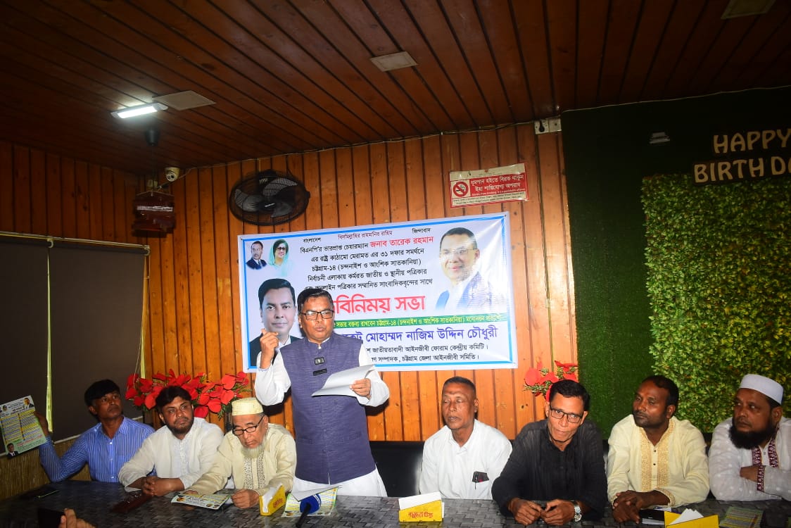 জাতীয়তাবাদী আইনজীবী ফোরামের কেন্দ্রীয় সহ-সভাপতি, চট্টগ্রাম জেলা আইনজীবী সমিতির সাবেক সভাপতি এডভোকেট মো. নাজিম উদ্দীন চৌধুরী চন্দনাইশে কর্মরত গণমাধ্যমকর্মীদের সাথে মতবিনিময় করেন।