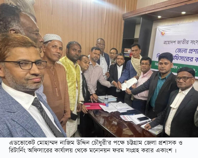 আসন্ন ত্রয়োদশ জাতীয় সংসদ নির্বাচনে এখনো ধানের শীষের প্রার্থী না দেওয়ায় চট্টগ্রাম-১৪ আসনে বাংলাদেশ জাতীয়তাবাদী আইনজীবী ফোরাম কেন্দ্রীয় কমিটির সহ-সভাপতি ও চট্টগ্রাম জেলা আইনজীবী সমিতির সাবেক সভাপতি ও সাধারণ সম্পাদক এডভোকেট মোহাম্মদ নাজিম উদ্দিন চৌধুরী'র ধানের শীষের পক্ষে গত ২২ ডিসেম্বর (সোমবার) চট্টগ্রাম জেলা প্রশাসক ও রিটার্নিং অফিসারের কার্যালয় থেকে মনোনয়ন ফরম সংগ্রহ করেছেন এডভোকেট মোহাম্মদ হামিদুর রশিদ চৌধুরী।