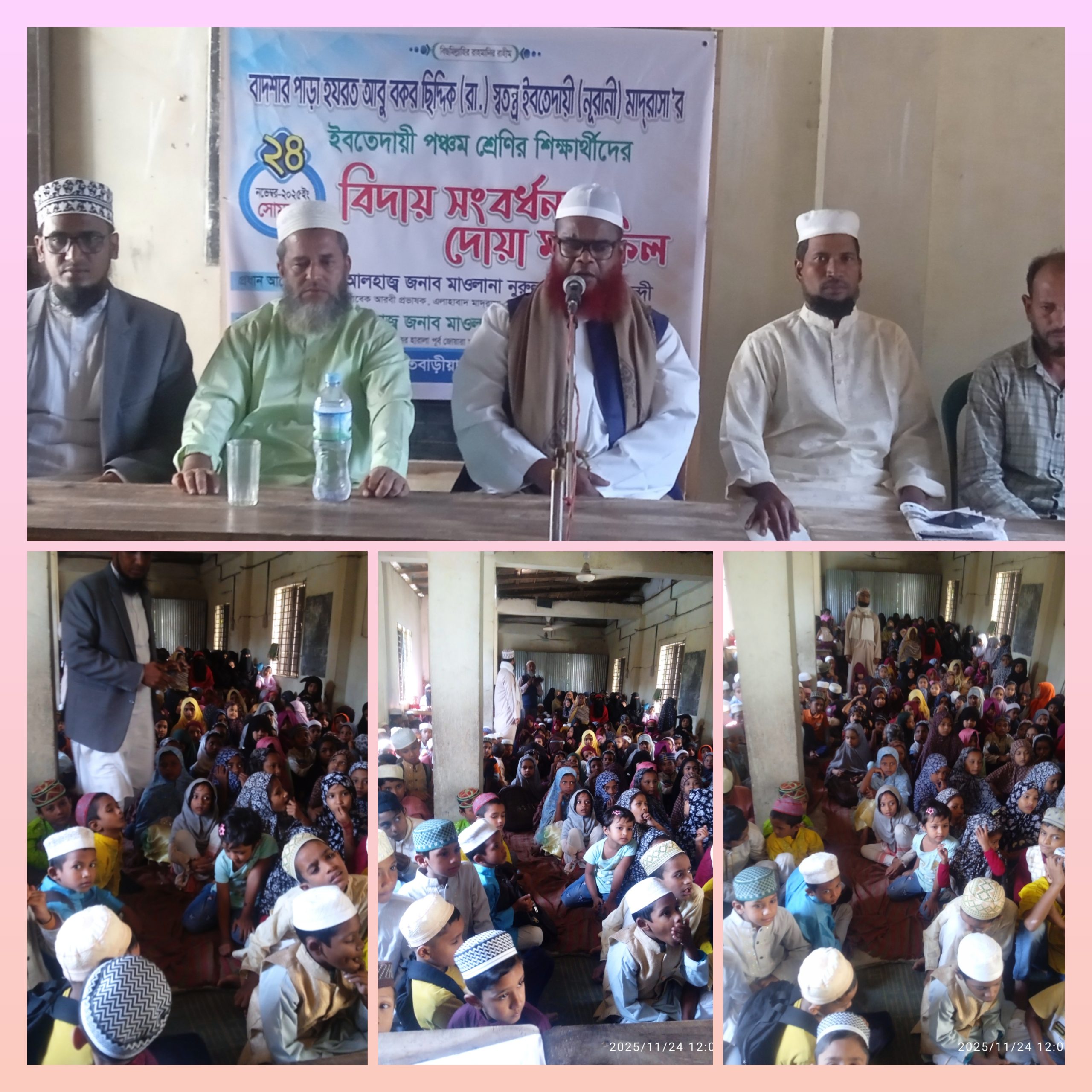 চন্দনাইশের সাতবাড়ীয়ায় বাদশা'র পাড়া হযরত আবু বক্কর ছিদ্দিক রা.স্বতন্ত্র ইবতেদায়ী মাদ্রাসায় ইবতেদায়ী ৫ম শ্রেণির শিক্ষার্থীদের বিদায় সংবর্ধনা ও দোয়া মাহফিল অনুষ্ঠিত হয়েছে। ২৪ নভেম্বর, সোমবার আরবি প্রভাষক মৌলানা হারুনুর রশিদের সভাপতিত্বে আয়োজিত অনুষ্ঠানে প্রধান অতিথি ছিলেন পশ্চিম এলাহাবাদ মাদ্রাসার সাবেক আরবি প্রভাষক আল্লামা নুরুল ইসলাম নক্স'বন্দী।বিশেষ অতিথি হিসেবে উপস্থিত ছিলেন সমাজসেবক আবদুল মোনাফ,মোহাম্মদ মুছা,মোহাম্মদ কাশেম,ফখরুল ইসলাম প্রমুখ।