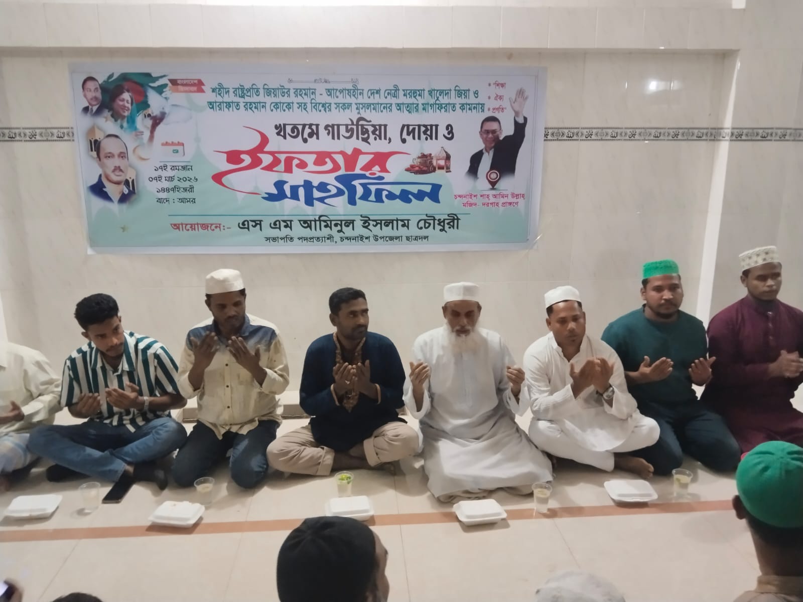 চট্টগ্রামের চন্দনাইশে বাংলাদেশ জাতীয়তাবাদী ছাত্রদলের উদ্যোগে ইফতার ও দোয়া মাহফিল অনুষ্ঠিত হয়েছে। শনিবার (৭ মার্চ) চন্দনাইশ সদর শাহ আমিন উল্লাহ মসজিদ ও মাজার প্রাঙ্গণে এই অনুষ্ঠানের আয়োজন করা হয়। চন্দনাইশ পৌর ও উপজেলা ছাত্রদলের বিভিন্ন ইউনিটের নেতাকর্মীসহ স্থানীয় বিএনপি ও অঙ্গসংগঠনের বিপুল সংখ্যক সমর্থক এই মাহফিলে অংশ নেন। মাহফিলে বক্তারা রমজানের পবিত্রতা রক্ষা এবং দলীয় ঐক্য সুদৃঢ় করার আহ্বান জানান।ইফতারের আগে অনুষ্ঠিত বিশেষ মোনাজাতে দেশের শান্তি ও সমৃদ্ধি কামনা করা হয়। এছাড়া শহীদ রাষ্ট্রপতি জিয়াউর রহমান, সাবেক প্রধানমন্ত্রী বেগম খালেদা জিয়া ও আরাফাত রহমান কোকোর আত্মার মাগফিরাত এবং তারেক রহমানের দীর্ঘায়ু কামনা করে দোয়া করা হয়।ইফতার মাহফিলের আয়োজক ও উপজেলা ছাত্রদলের সভাপতি পদপ্রার্থী এস. এম. আমিনুল ইসলাম চৌধুরী তাঁর বক্তব্যে বলেন, "শহীদ জিয়ার আদর্শে উজ্জীবিত হয়ে দেশনায়ক তারেক রহমানের নেতৃত্বে আমাদের ঐক্যবদ্ধ থাকতে হবে। বর্তমান সংকটময় মুহূর্তে দেশকে ঋণমুক্ত ও সমৃদ্ধ করতে জনাব তারেক রহমানের হাতকে শক্তিশালী করার বিকল্প নেই।" তিনি সকল সংসদ সদস্য ও নেতাকর্মীদের নিজ নিজ দায়িত্ব পালনের মাধ্যমে সরকারকে সহযোগিতা করার উদাত্ত আহ্বান জানান।অনুষ্ঠানে অন্যান্যদের মধ্যে উপস্থিত ছিলেন— কাঞ্চনাবাদ ইউনিয়ন যুবদল নেতা এম নোমান শিবলী, যুবদল নেতা মো. ইমরান, দক্ষিণ জেলা ছাত্রদলের যুগ্ম আহ্বায়ক অলিউল হোসেন এবং বরমা ডিগ্রি কলেজ ছাত্রদল সভাপতি সুহান। আরও উপস্থিত ছিলেন ছাত্রনেতা ইসমাইল হোসেন, কাজম চৌধুরী, তাসকিন আহমেদ আরিফ, পিয়েল চৌধুরী, মোহাম্মদ সাইদ, মোজাম্মেল, ইলিয়াস, এমরান, মিন্টু, জিসানসহ যুবদল ও ছাত্রদলের অসংখ্য নেতাকর্মী।