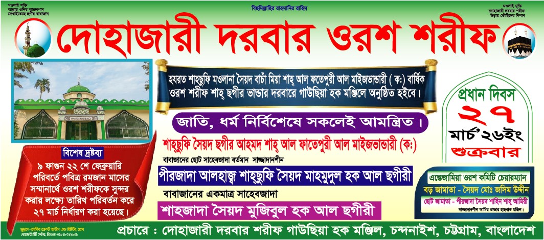 চট্টগ্রামের চন্দনাইশ উপজেলার দোহাজারী দরবার শরীফ গাউছিয়া হক মঞ্জিলের উদ্যোগে পবিত্র বার্ষিক ওরশ শরীফ আগামীকাল ২৭শে মার্চ, শুক্রবার অনুষ্ঠিত হতে যাচ্ছে। দরবার শরীফ সূত্রে জানানো হয়েছে, বিশেষ কারণে ওরশ শরীফের পূর্বনির্ধারিত তারিখ (৯ ফাল্গুন/২২ ফেব্রুয়ারি) পরিবর্তন করে পবিত্র রমজান মাসের সম্মানে ও অনুষ্ঠানটি সুচারুভাবে সম্পন্ন করার লক্ষ্যে আগামীকাল ২৭শে মার্চ নির্ধারণ করা হয়েছে।
