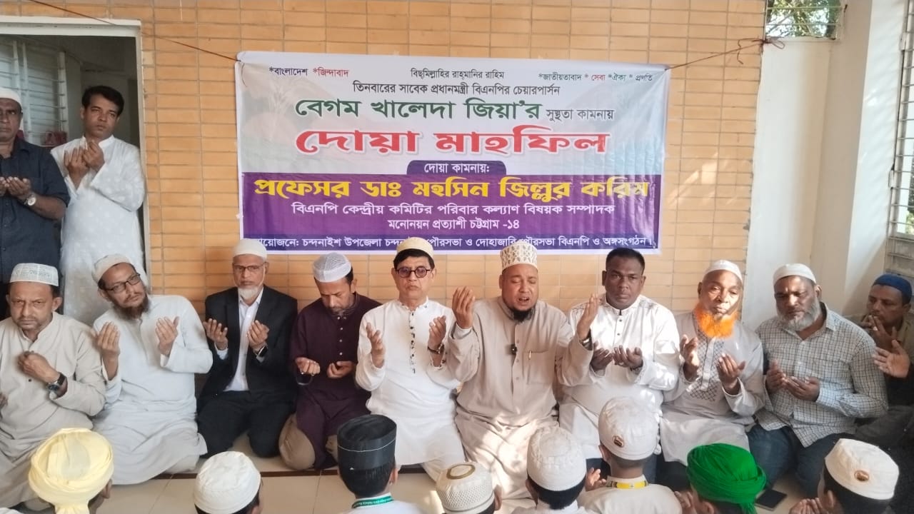 বিএনপির চেয়ারপার্সন, তিন বারের সাবেক প্রধানমন্ত্রী, দেশনেত্রী, দেশমাতা বেগম খালেদা জিয়ার রোগমুক্তি ও সুস্থতা কামনায় চন্দনাইশ উপজেলা,চন্দনাইশ পৌরসভা ও দোহাজারী পৌরসভার যৌথ উদ্যোগে ২৮ নভেম্বর, শুক্রবার বাদে জুমা বরকল মৌলভীবাড়ী জামে মসজিদে মিলাদ ও কিয়াম শেষে পাশ্ববর্তী বিএনপির অস্থায়ী কার্যালয়ে এক দোয়া মাহফিল বিএনপির কেন্দ্রীয় পরিবার কল্যাণ বিষয়ক সম্পাদক ও চট্টগ্রাম-১৪ আসনের ধানের শীষের সাম্ভাব্য প্রার্থী প্রফেসর ডাক্তার মহসিন জিল্লুর করিমের সভাপতিত্ব অনুষ্ঠিত হয়।
