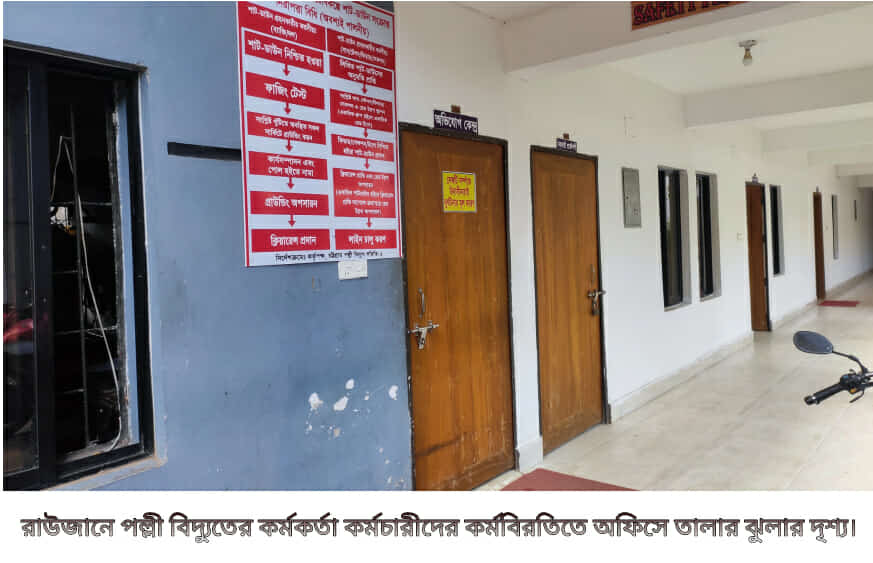 জরুরী সেবা অফিসের দরজা বন্ধ, আবার কোন অফিসে ঝুলছিল তালা।পল্লী বিদ্যুতের কর্মকর্তা-কর্মচারীদের না পেয়ে ফিরে যাচ্ছেন বিভিন্ন প্রান্থ থেকে আসা সেবা প্রার্থীরা। দিনভর এমন ভোগান্তি ছিল রাউজানে অবস্থিত চট্টগ্রাম পল্লী বিদ্যুৎ সমিতি-২ এর কার্যালয়ে। জানা যায়, বাংলাদেশ পল্লী বিদ্যুতায়ন বোর্ড (বিআরইবি) ও পল্লী বিদ্যুৎ সমিতির একীভূতকরণসহ চার দফা দাবিতে অনির্দিষ্টকালের গণছুটি নামে কর্মবিরতি শুরু করেছেন পল্লী বিদ্যুৎ সমিতির কর্মকর্তা-কর্মচারীরা। গতকাল রবিবার, ৭ সেপ্টেম্বর সকাল থেকে শুরু হওয়া এই কর্মবিরতির কারণে বন্ধ ছিল জরুরী সেবাসহ সকল প্রকার সেবাদান কার্যক্রম। এতে চরম ভোগান্তীতে পড়তে হয় পল্লী বিদ্যুতের গ্রাহকদের। উপজেলার চিকদাইর ইউনিয়ন থেকে আসা সেবাপ্রত্যাশী মুসলিম উদ্দিন বলেন, ‘আমরা জরুরী সেবার জন্য এসেছিলাম। এখানে এসে দেখি কেউ নেই। ফিরে যাচ্ছি।’ সংশ্লিষ্ট সূত্র মতে, রাউজানে অবস্থিত চট্টগ্রাম পল্লীবিদ্যুৎ সমিতি-২ এর আওতায় ২ শতাধিক কর্মকর্তা কর্মচারী রয়েছেন।