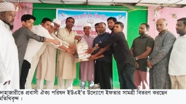 পবিত্র রমজান উপলক্ষে চন্দনাইশ উপজেলার দোহাজারী পৌরসভা প্রবাসী ঐক্য পরিষদ ইউ.এ.ই.-এর উদ্যোগে পৌরসভার ৯টি ওয়ার্ডের গরিব, দুস্থ ও মেহনতি মানুষের মাঝে ইফতার সামগ্রী বিতরণ করা হয়েছে। রোববার (৮ মার্চ) বিকাল ৩টায় দোহাজারী রূপনগর কমিউনিটি সেন্টারে এই উপলক্ষে এক আলোচনা সভা ও বিতরণ কর্মসূচির আয়োজন করা হয়। সংগঠনের উপদেষ্টা মোহাম্মদ আলীর সভাপতিত্বে অনুষ্ঠিত এই সভায় প্রধান অতিথি হিসেবে উপস্থিত ছিলেন দোহাজারী পৌরসভার সাবেক মেয়র আলহাজ্ব লোকমান হাকিম। সংগঠনের উপদেষ্টা জাহাঙ্গীর আলীর সঞ্চালনায় অনুষ্ঠানে বক্তব্য রাখেন, মাহাফুজুর রহমান, সংগঠনের প্রচার সম্পাদক আবদুল মজিদ, সদস্যবৃন্দ: শহীদ, ফারুক, ফরিদ, বোরহান, মিয়া হোসেন, আবদুল করিম প্রমুখ।