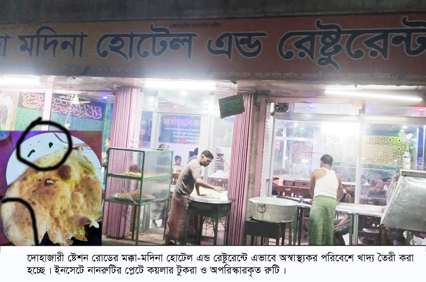দক্ষিণ চট্টগ্রামের দোহাজারী ষ্টেশন রোডে সম্প্রতি উদ্বোধন হওয়া মক্কা-মদিনা হোটেল রেষ্টুরেন্টে খাবারের অবস্থা নিন্মমানের বলে অভিযোগ উঠেছে। তাদের খাবার খোলা পরিবেশে তৈরী, খাদ্য সংশ্লিষ্ট কোনো নিয়মনীতি ও স্বাস্থ্যবিধির তোয়াক্কা না করে নোংরা পরিবেশে অবাধে বিক্রি হচ্ছে মুখরোচক খোলা খাবার। এ জাতীয় খাবার খেলে ডায়রিয়া, আমাশয়, টাইফয়েড, হেপাটাইটিসসহ বিভিন্ন সংক্রামক রোগ, আলসার ও হৃদরোগ ইত্যাদি হওয়ার সম্ভাবনা বেশি। এসব খাবার খেয়ে দিন দিন হুমকির মুখে পড়েছে জনস্বাস্থ্য।