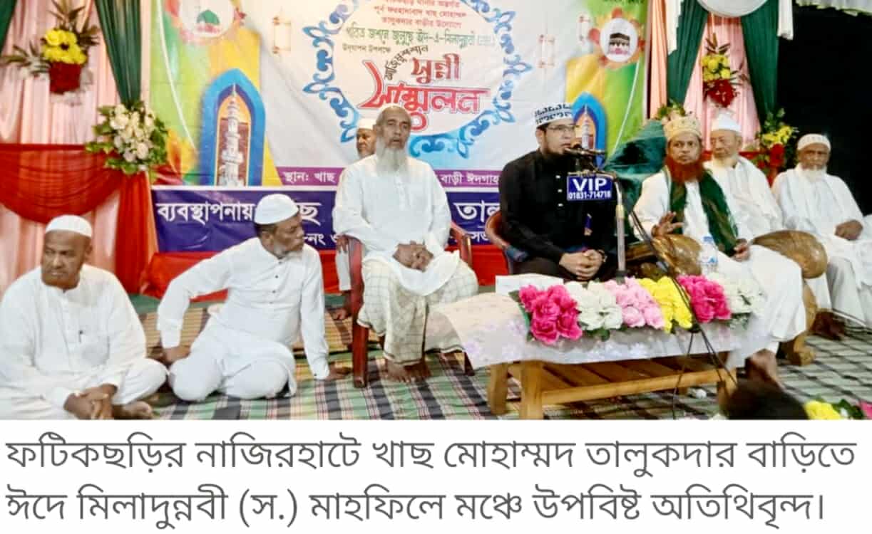 ফটিকছড়ি উপজেলার নাজিরহাট পৌরসভার ৮নং ওয়ার্ডের খাছ মোহাম্মদ তালুকদার বাড়ির উদ্যোগে প্রতি বছরের ন্যায় এবছরও ঈদে মিলাদুন্নবী (স.) উদযাপন উপলক্ষে সুন্নী সম্মেলন গত শনিবার বাড়ির ঈদগাহ মাঠে অনুষ্ঠিত হয়েছে।খাছ মো. তালুকদার বাড়ির জামে মসজিদের খতিব ও ফটিকছড়ি জামেউল উলুম ফাযিল মাদ্রাসা সহকারী অধ্যাপক আল্লামা মুহাম্মদ আবু তাহের আল কাদেরীর সভাপতিত্বে অনুষ্টিত
