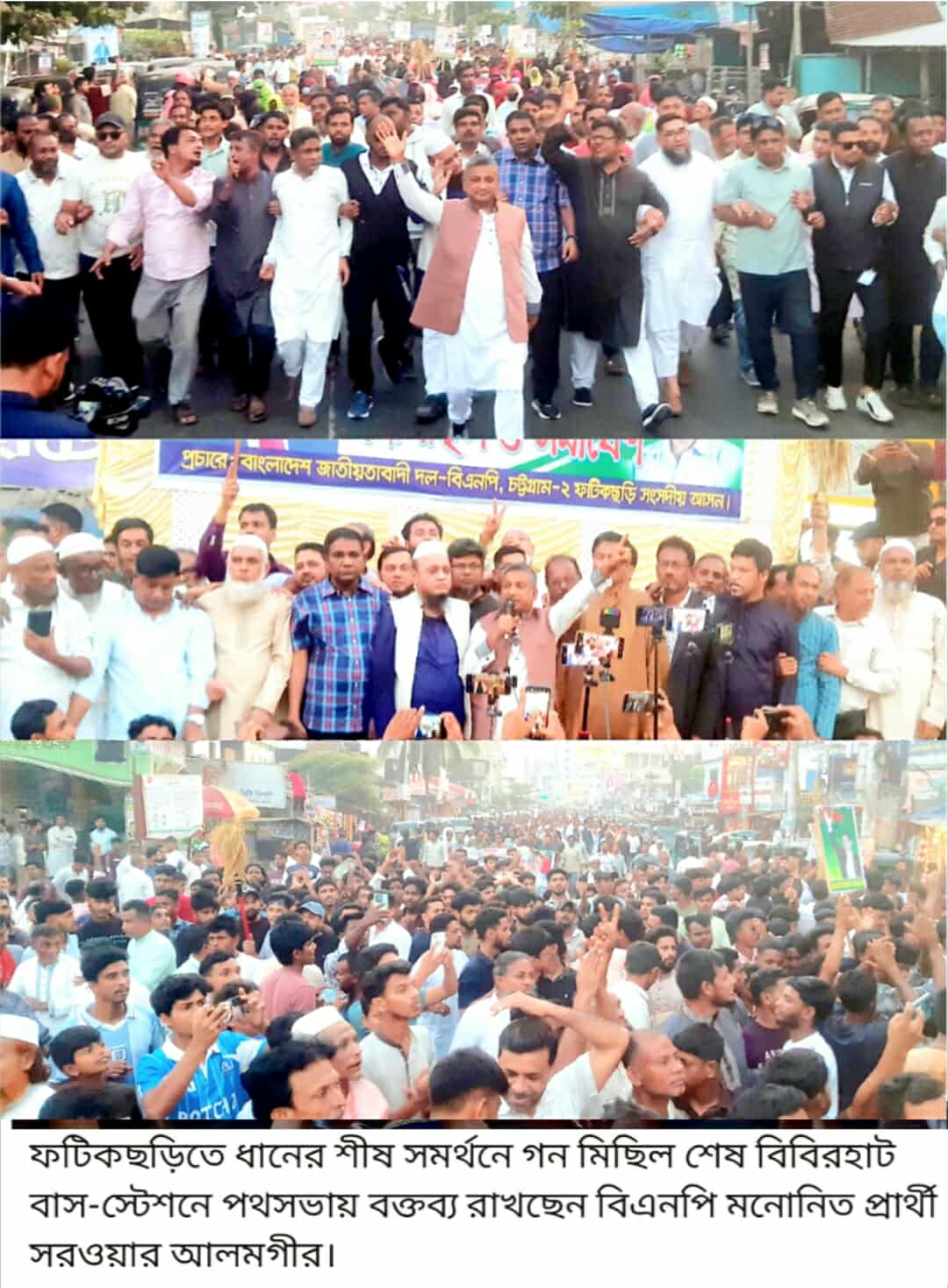 আসন্ন ত্রয়োদশ জাতীয় সংসদ নির্বাচনে চট্টগ্রাম-২ ফটিকছড়ি আসন হতে বিএনপি'র মনোনীত ধানের শীষ প্রতীকের প্রার্থী ও জেলা বিএনপির সাবেক যুগ্ম আহবায়ক সরওয়ার আলমগীর বলেছেন যতদিন বেঁচে থাকি ততদিন ফটিকছড়িবাসীকে সাথে নিয়ে থাকবো। আমার আগামী জীবন ফটিকছড়িবাসীর জন্য উৎসর্গ করলাম। শুক্রবার ২১ নভেম্বর বিকালে ধানের শীষ প্রতীকের সমর্থনে ফটিকছড়ি বিএনপির স্মরণ কালের সর্ববৃহৎ গণ মিছিল ফটিকছড়ি সরকারী কলেজের সম্মূখ হতে বিবিরহাট বাজারের কলেজ রোড, ঈদগাহ রোড হয়ে চট্টগ্রাম - খাগড়াছড়ি সড়কের বাস ষ্টেশন গিয়ে শেষ হয়। পরে উপজেলা সদর বাস স্টেশনে আয়োজিত সমাবেশে তিনি এ কথা বলেন।