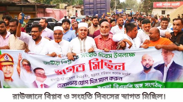 আগামী ৭ নভেম্বর রাউজান কলেজ মাঠে বিপ্লব ও সংহতি দিবস উপলক্ষে বিশাল জনসমাবেশকে সফল করতে আজ ৪ নভেম্বর রাউজান উপজেলা, পৌরসভা বিএনপি ও অঙ্গ সংগঠনের যৌথ উদ্যোগে দক্ষিণ রাউজানের নোয়াপাড়া পথের হাটে কাপ্তাই সড়কে স্বাগত মিছিল ও সমাবেশ অনুষ্ঠিত হয়েছে। উত্তর জেলা বিএনপি সাবেক শিক্ষা বিষয়ক সম্পাদক মুহাম্মদ হাবিব উল্লাহ মাস্টারের সভাপতিত্বে প্রধান অতিথি ছিলেন রাউজান উপজেলা বিএনপি যুগ্ম আহবায়ক ফিরোজ আহমেদ।