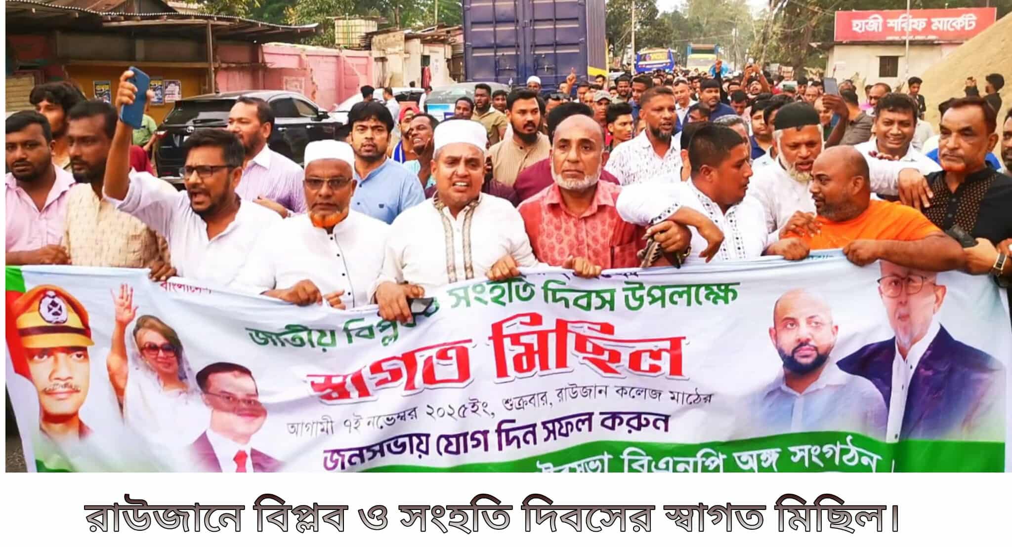 আগামী ৭ নভেম্বর রাউজান কলেজ মাঠে বিপ্লব ও সংহতি দিবস উপলক্ষে বিশাল জনসমাবেশকে সফল করতে আজ ৪ নভেম্বর রাউজান উপজেলা, পৌরসভা বিএনপি ও অঙ্গ সংগঠনের যৌথ উদ্যোগে দক্ষিণ রাউজানের নোয়াপাড়া পথের হাটে কাপ্তাই সড়কে স্বাগত মিছিল ও সমাবেশ অনুষ্ঠিত হয়েছে। উত্তর জেলা বিএনপি সাবেক শিক্ষা বিষয়ক সম্পাদক মুহাম্মদ হাবিব উল্লাহ মাস্টারের সভাপতিত্বে প্রধান অতিথি ছিলেন রাউজান উপজেলা বিএনপি যুগ্ম আহবায়ক ফিরোজ আহমেদ।