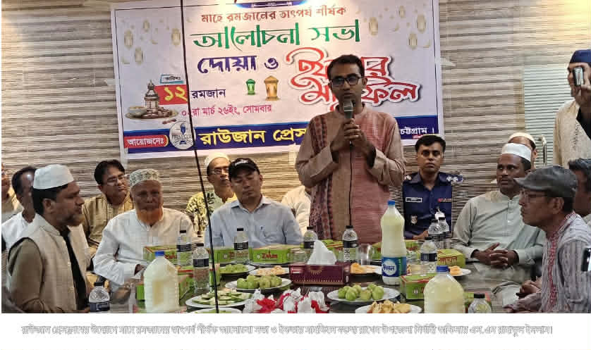 রাউজান প্রেসক্লাবের উদ্যোগে পবিত্র মাহে রমজানের তাৎপর্য শীর্ষক আলোচনা সভা, দোয়া ও ইফতার মাহফিল অনুষ্ঠিত হয়েছে। ২ মার্চ সোমবার বিকেলে রাউজান প্রেস রাউজান প্রেসক্লাবের সভাপতি প্রদীপ শীলের সভাপতিত্বে ও সাধারণ সম্পাদক এম.নেজাম উদ্দিন রানার সঞ্চালনায় অনুষ্ঠানে প্রধান অতিথি ছিলেন রাউজান উপজেলা নির্বাহী কর্মকর্তা এস. এম. রাহাতুল ইসলাম। বিশেষ অতিথি ছিলেন রাউজান উপজেলা সহকারি কমিশনার (ভূমি) ও পৌর প্রশাসক অংছিং মারমা, উপজেলা প্রকৌশলী আবুল কালাম, উপজেলা প্রাথমিক শিক্ষা কর্মকর্তা নুর নবী, পৌরসভার প্রকৌশলী শাহীন শাহ হোসেন, উত্তর জেলা বিএনপির কার্যনির্বাহী সদস্য মাস্টার আবু জাফর চৌধুরী, পৌর বিএনপির সাবেক সাধারণ সম্পাদক সৈয়দ মঞ্জুরুল হক, উপজেলা জামায়াতে ইসলামীর সাধারণ সম্পাদক রেদোয়ান শাহ, পৌর বিএনপির সাবেক যুগ্ম আহ্বায়ক কাজী আনিসুজ্জামান চৌধুরী সোহেল, উত্তর জেলা যুবদলের যোগাযোগ বিষয়ক সম্পাদক সৈয়দ মুহাম্মদ তৌহিদুল আলম, উত্তর জেলা স্বেচ্ছাসেবক দলের যুগ্ম আহ্বায়ক ইউসুফ তালুকদার , উপজেলা যুবদলের সভাপতি এম শাহজান শাকিল, স্বেচ্ছাসেবক দল নেতা একরাম মিয়া, উত্তর জেলা স্বেচ্ছাসেবক দলের সাবেক সহ ক্রীড়া সম্পাদক মোহাম্মদ আলী সুমন, উপজেলা যুবদলের সাধারণ সম্পাদক সাইফুল আজম ছোটন, পৌর স্বেচ্ছাসেবক দলের সভাপতি শাহাদাত মির্জা, যুবদল নেতা সাজ্জাদ হোসেন, শহীদ চৌধুরী, চট্টগ্রাম উত্তর জেলা যুবদলের সদস্য মোহাম্মদ হোসেন, ইকতিয়ার উদ্দিন মেম্বার, রাউজান থানার উপ পরিদর্শক মোঃ হাসান, সাংসদ আলহাজ গিয়াস উদ্দিন কাদের চৌধুরীর প্রেস সচিব খোরশেদুল আলম, ফটিকছড়ি প্রেসক্লাবের সাবেক সাধারণ সম্পাদক সোলাইমান আকাশ, হাটহাজারী সাংবাদিক ঐক্য পরিষদের সভাপতি আসলাম পারভেজ, সাংবাদিক সুমন পল্লব, দোয়া ও মোনাজাত পরিচালনা করেন প্রেসক্লাবের সাবেক সভাপতি এম বেলাল উদ্দীন। বক্তব্য রাখেন রাউজান প্রেসক্লাবের সাবেক সভাপতি মীর আসলাম, সিনিয়র সহ সভাপতি এস এম ইউসুফ উদ্দিন, সহ সভাপতি গাজী জয়নাল আবেদীন, নির্বাহী সদস্য এম রমজান আলী, কামরুল ইসলাম বাবু, শাহেদুর রহমান মোরশেদ, সহ সভাপতি কামাল উদ্দিন, মো. হাবিবুর রহমান, যীশু সেন, যুগ্ম সম্পাদক আরফাত হোসাইন, শাহাদাত হোসেন সাজ্জাদ, অর্থ সম্পাদক আনিসুর রহমান, দপ্তর সম্পাদক আবিদ মাহমুদ, প্রচার ও প্রকাশনা সম্পাদক রয়েল দত্ত। এসময় উপস্থিত ছিলেন মো. এরশাদ, হেলাল উদ্দিন, উপজেলা যুবদলের সাংগঠনিক সম্পাদক রিয়াদ চৌধুরী, ছাত্রদল নেতা মোঃ আরিফ, রহিম উদ্দিন ওয়াসিম, নিজাম উদ্দিন। বক্তারা বলেন, রমজান মাস ইবাদতের মাস। এটি শুধু রোজা রাখার মাস নয়; এটি আত্মশুদ্ধি ও হৃদয়ের চিকিৎসার শ্রেষ্ঠ সময়। এই মাসে পরিপূর্ণ ইবাদতের মাধ্যমে আল্লাহর সন্তুষ্টি অর্জ