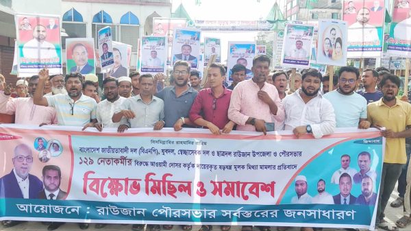 রাউজানে বিএনপির দুপক্ষে সংঘর্ষের ঘটনায় কেন্দ্রীয় বিএনপির নেতা গোলাম আকবর খোন্দকার অনুসারী কর্তৃক সাবেক সংসদ সদস্য গিয়াস উদ্দিন কাদের চৌধুরীর অনুসারী বিএনপি, যুবদল ও স্বেচ্ছাসেবক দলের রাউজান উপজেলা এবং পৌরসভার ১২৯ নেতাকর্মীর বিরুদ্ধে করা মামলাকে মিথ্যা মামলা আখ্যায়িত করে প্রত্যাহারের দাবিতে রাউজান পৌরসভার সর্বস্থরের জনসাধারণের ব্যানারে বিক্ষোভ মিছিল ও সমাবেশ অনুষ্ঠিত হয়েছে। মিছিল শেষে সমাবেশে বক্তারা বলেন, উত্তর জেলা যুবদলের সহ-সভাপতি সাবের সুলতান কাজল, পৌর বিএনপির সাবেক সাধারণ সৈয়দ মঞ্জুরুল হক, যুবদল নেতা মো. রেওয়াজ, উত্তর জেলা যুবদলের শ্রম বিষয়ক সম্পাদক সোহেল চৌধুরী৷ উত্তর জেলা স্বেচ্ছাসেবক দলের সহ-ক্রীড়া বিষয়ক সম্পাদক মো. আলী সুমন , স্বেচ্ছাসেবক দলের পৌর আহবায়ক শাহাদাত মির্জাসহ ১২৯ নেতাকর্মীর বিরুদ্ধে করা মিথ্যা মামলা প্রত্যাহার করতে হবে। সোমবার (২৫আগস্ট) বিকেল ৪টায় উপজেলা সদরের মুন্সিরঘাটা থেকে মিছিল শুরু হয়। মিছিলটি ফকিরহাটাস্থ, দলীয় কার্যালয়ের সামনে শেষ হয়। রাউজান থানা সড়ক প্রদক্ষিণ করে মুন্সিরঘাটা এসে সমাবেশের মধ্যদিয়ে শেষ হয়। সভাপতিত্ব করেন যুবদল নেতা মোহাম্মদ মঞ্জু, প্রধান অতিথি ছিলেন উত্তর জেলা ছাত্রদলের সহ-সাধারণ সম্পাদক মো. আরিফুল ইসলাম। প্রধান বক্তা ছিলেন সাবেক ছাত্রনেতা রিয়াজ উদ্দিন চৌধুরী। বক্তব্য রাখেন ,যুবদল নেতা মো. ফোরকান, শ্রমিক দল নেতা রফিকুল ইসলাম, আবুল হাসেম, মো. হারুন, রাশেদ, শাকিল, জাবের উদ্দিন জাবেদ। এসময় রাউজান পৌরসভার সর্বস্তরের জনসাধারণ উপস্থিত ছিলেন৷