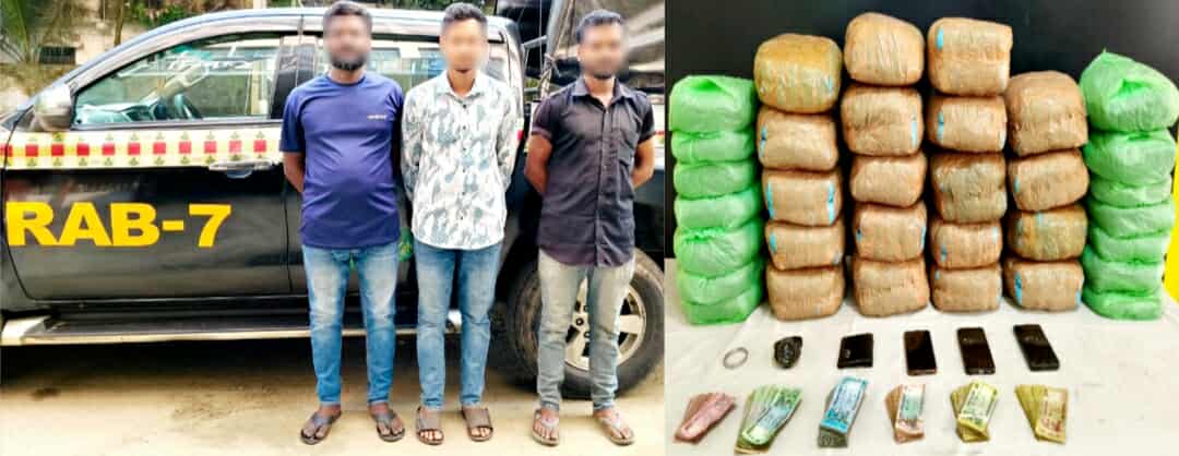 চট্টগ্রামের ফটিকছড়ি উপজেলার ভূজপুর থানাধীন বাগান বাজার ইউনিয়নের একটি বসতঘর থেকে ৫১ কেজি গাঁজাসহ ৩ জনকে গ্রেপ্তার করেছে র্যাব-৭। রবিবার ২৬ অক্টোবর উক্ত ইউনিয়নের চিকনছড়া এলাকা থেকে তাদের গ্রেপ্তার করা হয়। উদ্ধারকৃত মাদকদ্রব্যের মূল্য আনুমানিক মূল্য ৮ লাখ টাকা।