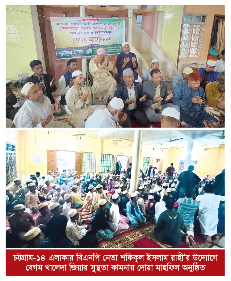 চট্টগ্রাম-১৪ (চন্দনাইশ–সাতকানিয়া আংশিক) আসনে ধানের শীষের মনোনয়ন প্রত্যাশী বিএনপি নেতা শফিকুল ইসলাম রাহীর উদ্যোগে তিনবারের প্রধানমন্ত্রী ও বিএনপির চেয়ারপার্সন বেগম খালেদা জিয়ার রোগমুক্তি ও সুস্থতা কামনায় বিশেষ দোয়া ও মিলাদ মাহফিলের আয়োজন করা হয়েছে।