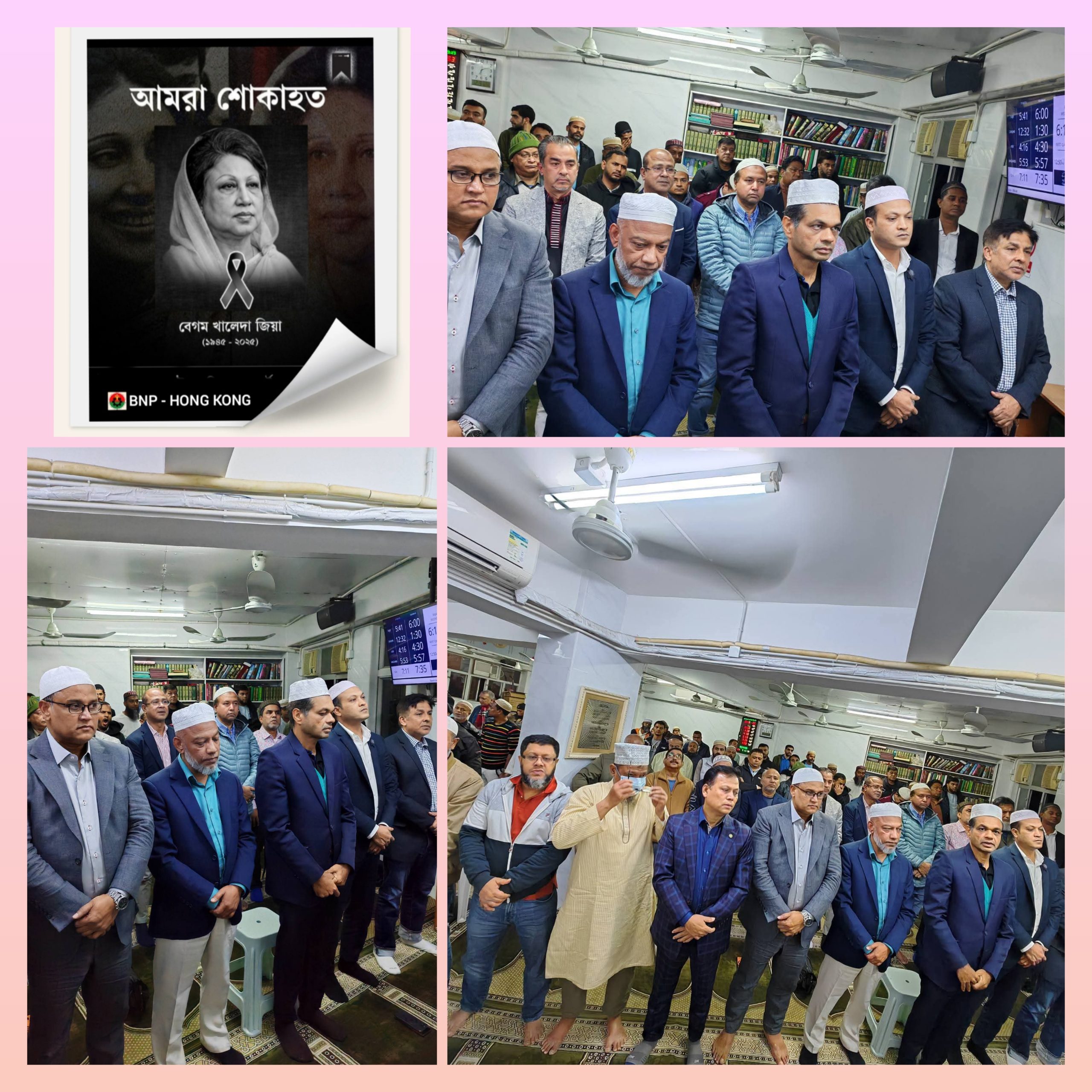 বাংলাদেশের সাবেক তিন তিনবারের সফল প্রধানমন্ত্রী,দেশ ও জনগণের স্বার্থ রক্ষায় আপোষহীন নেত্রী, গণতন্ত্রের মা বেগম খালেদা জিয়ার গায়েবানা নামাজের জানাযা হংকং সাম সুই পু মসজিদে আদায় করা হয়েছে। উক্ত জানাযার নামাজে উপস্থিত ছিলেন বাংলাদেশ জাতীয়তাবাদী দল (বিএনপি'র) হংকং শাখার সভাপতি মোহাম্মদ জাফর আলী,সাধারণ সম্পাদক এস রহমান জহির,বাংলাদেশ কনস্যুলেট জেনারেল (হংকং) ড. মোহাম্মদ তানভীর, বিএনপি হংকং শাখার দায়িত্বশীল নেতৃবৃন্দ, কর্মী-সমর্থক সহ হংকং প্রবাসী সর্বস্তরের গণ্যমান্য বাংলাদেশিরা নামাযে অংশ গ্রহণ করেন। মসজিদ এলাকায় বিএনপি নেতা-কর্মী সহ বিপুলসংখ্যক বাংলাদেশীর পাশাপাশি বিভিন্ন দেশের মুসলিমগণও নামাজে অংশগ্রহণের জন্য সমবেত হয়।গায়েবানা নামাজ শেষে মরহুমা বেগম খালেদা জিয়ার রুহের মাগফিরাত কামনা করে দোয়া করা হয়।গায়েবানা জানাযার নামাজে ইমামতি করেন মুফতি ইফতেখার হোসাইন।